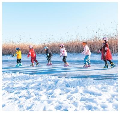 小朋友在甘肃张掖国家湿地公园冰场滑冰健身,在冰雪运动中强健体魄,解锁别样欢乐。