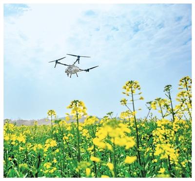 湖北省黄冈市浠水县汪岗镇高家畈村千亩油菜田里,种粮大户利用植保无人机为油菜施肥。