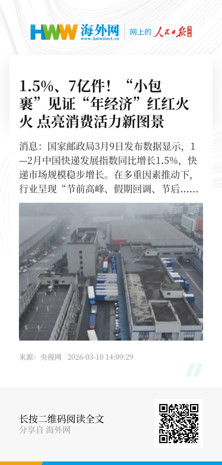 央视网消息:国家邮政局3月9日发布数据显示,1—2月中国快递发展指数同比增长1.5%,快递市场规模稳步增长。在多重因素推动下,行业呈现“节前高峰、假期回调、节后反弹”的周期波动,展现出较强韧性。
