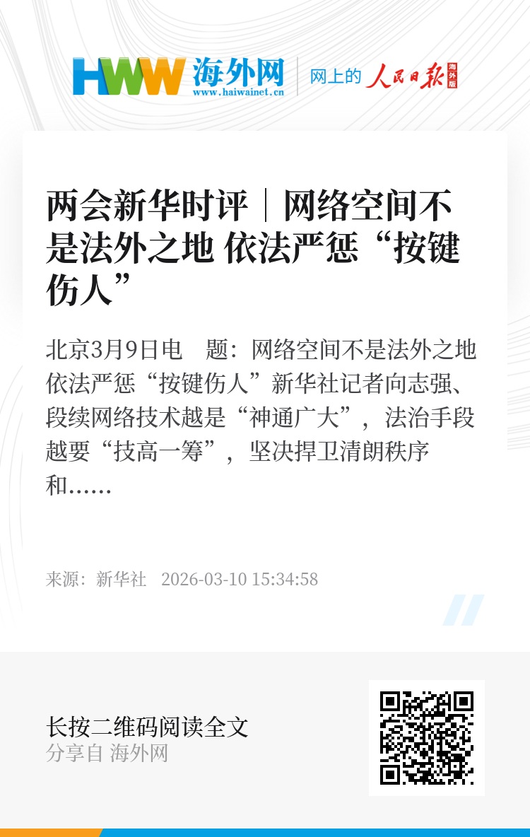 9日提请审议的“两高”工作报告回应社会关切,明确将网络生态治理列入2026年工作重点,进一步传递鲜明态度:网络空间不是法外之地,对网络谣言、网络敲诈、网络暴力、“网络水军”等新型违法犯罪,司法部门将密切跟进,依法严惩“按键伤人”。