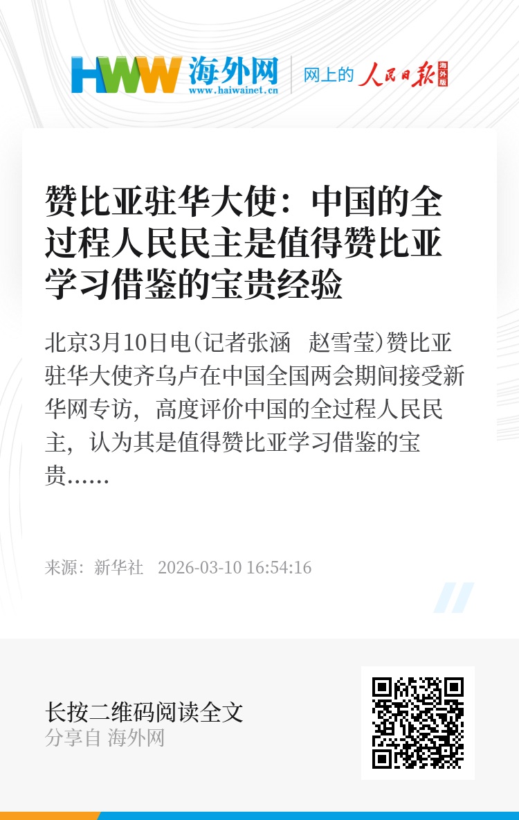 新华网北京3月10日电(记者张涵 赵雪莹)赞比亚驻华大使齐乌卢在中国全国两会期间接受新华网专访,高度评价中国的全过程人民民主,认为其是值得赞比亚学习借鉴的宝贵经验。