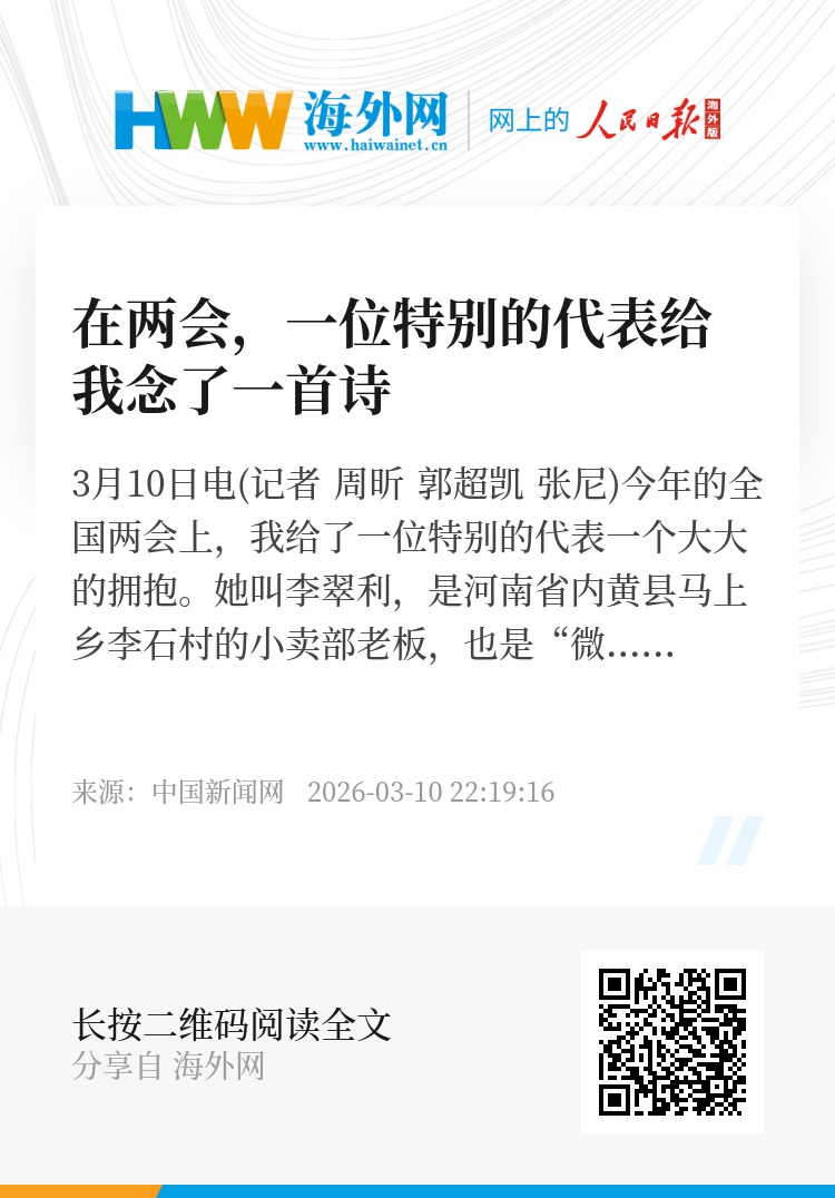 中新网3月10日电(记者 周昕 郭超凯 张尼)今年的全国两会上,我给了一位特别的代表一个大大的拥抱。