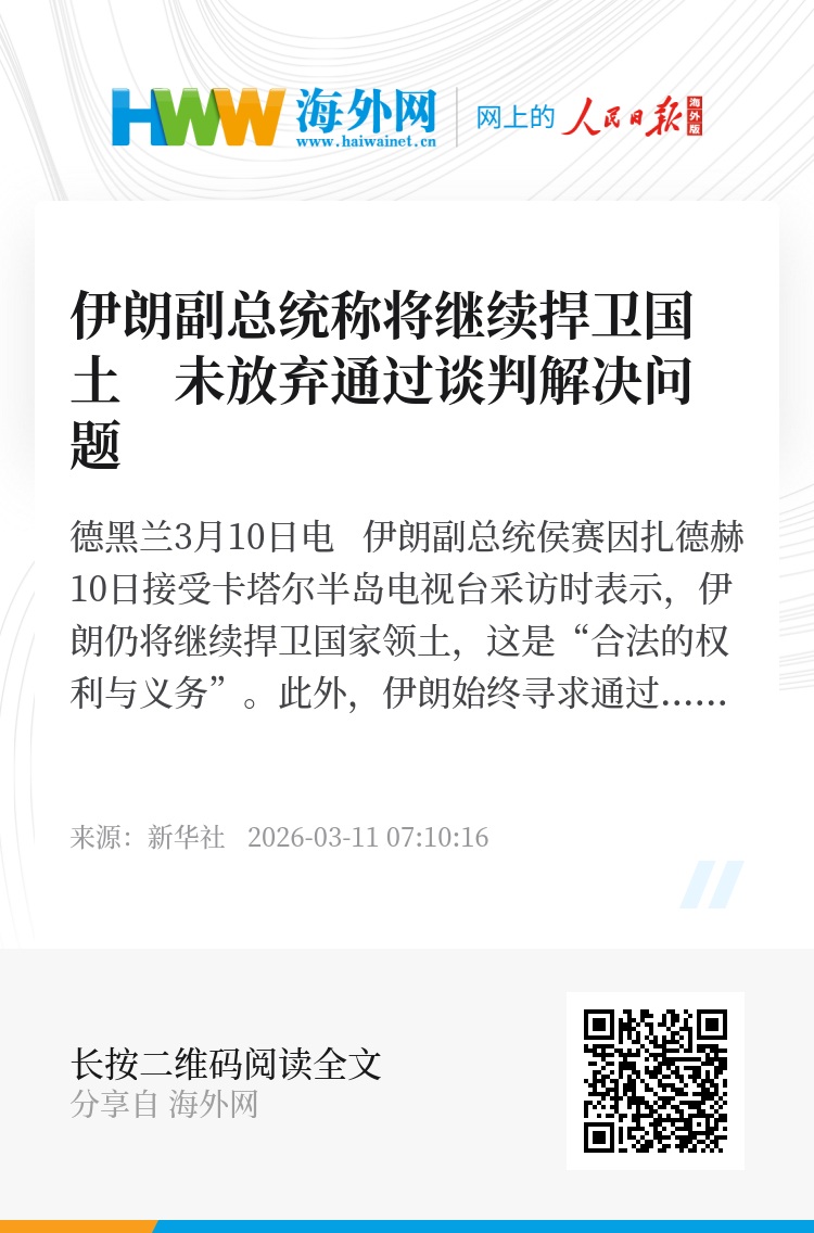 新华社德黑兰3月10日电 伊朗副总统侯赛因扎德赫10日接受卡塔尔半岛电视台采访时表示,伊朗仍将继续捍卫国家领土,这是“合法的权利与义务”。此外,伊朗始终寻求通过对话解决危机,也并非针对邻国发动攻击。