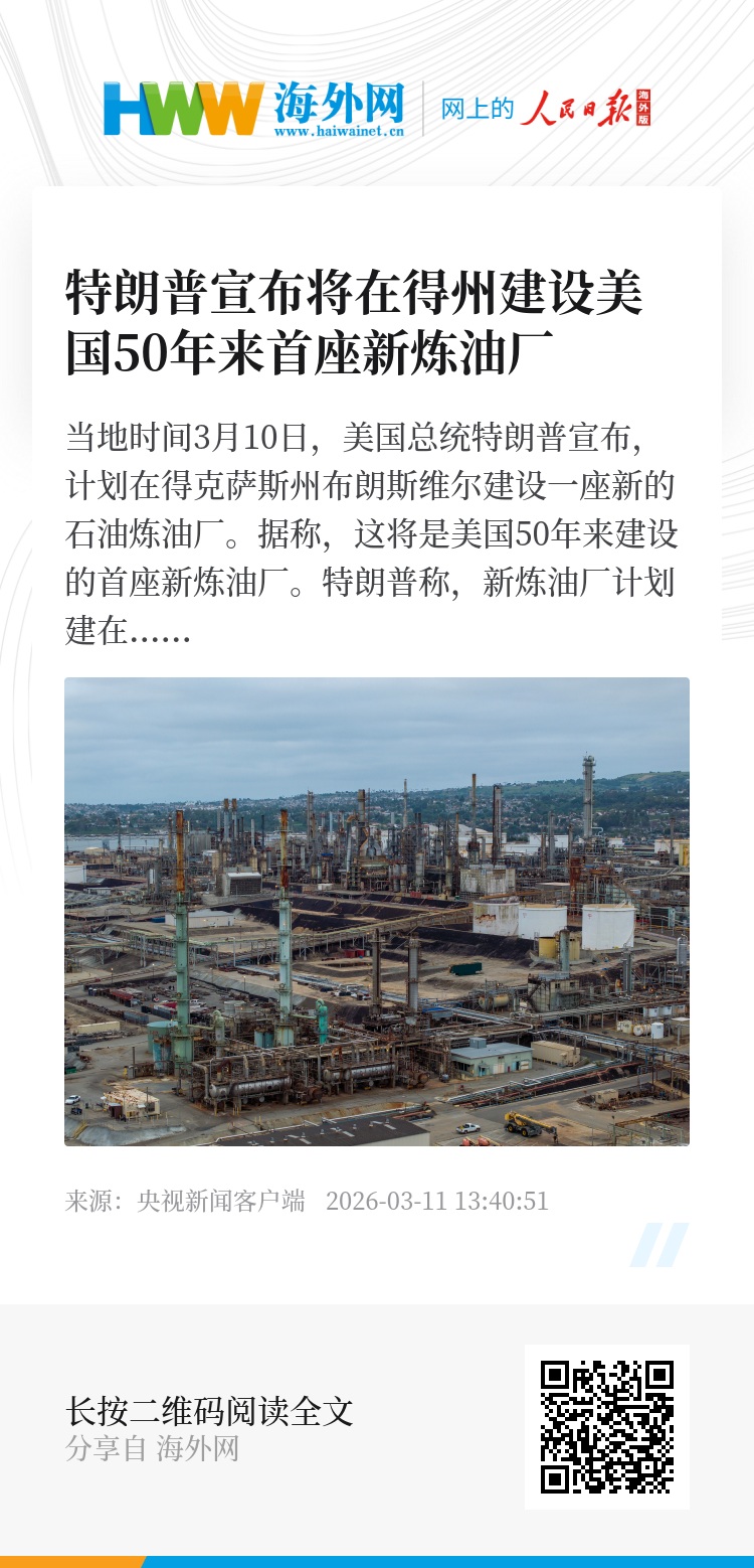 当地时间3月10日,美国总统特朗普宣布,计划在得克萨斯州布朗斯维尔建设一座新的石油炼油厂。据称,这将是美国50年来建设的首座新炼油厂。