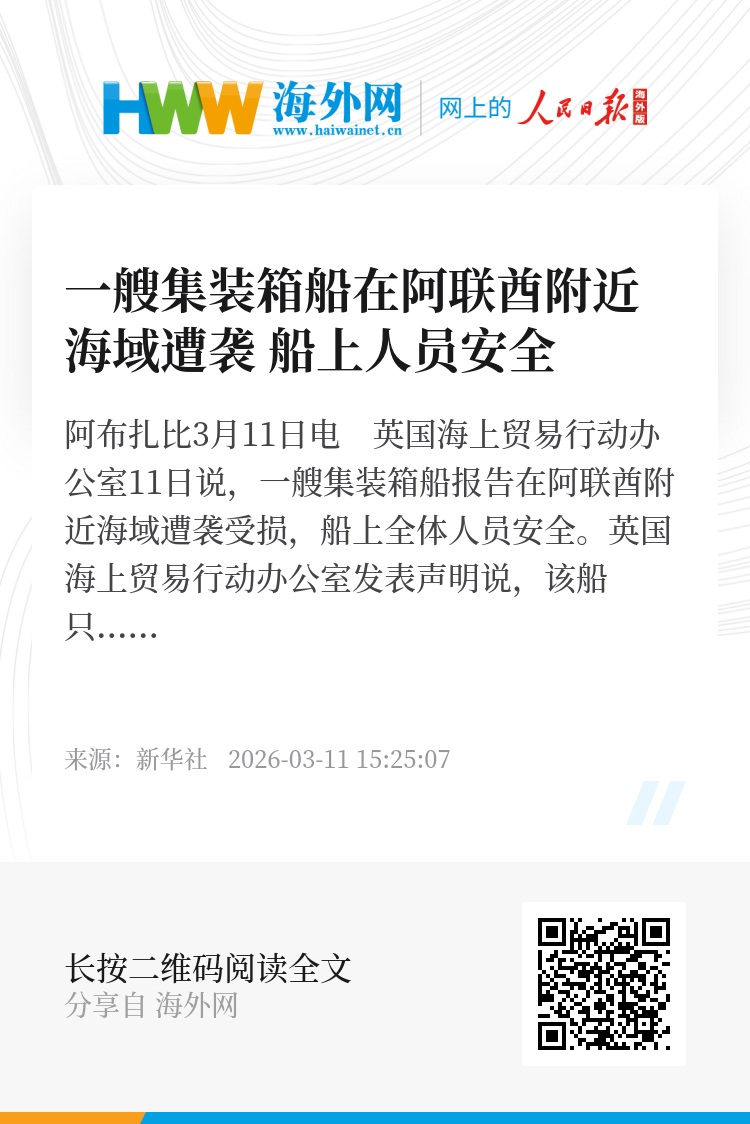 新华社阿布扎比3月11日电 英国海上贸易行动办公室11日说,一艘集装箱船报告在阿联酋附近海域遭袭受损,船上全体人员安全。