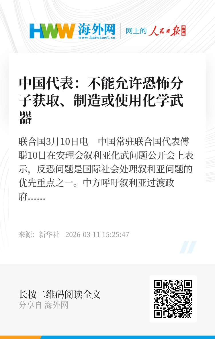 新华社联合国3月10日电 中国常驻联合国代表傅聪10日在安理会叙利亚化武问题公开会上表示,反恐问题是国际社会处理叙利亚问题的优先重点之一。中方呼吁叙利亚过渡政府履行国际义务,采取一切有效措施,坚决打击包括“东伊运”在内的所有被安理会列名的国际恐怖组织。任何情况下都不能允许恐怖分子获取、制造或使用化学武器。