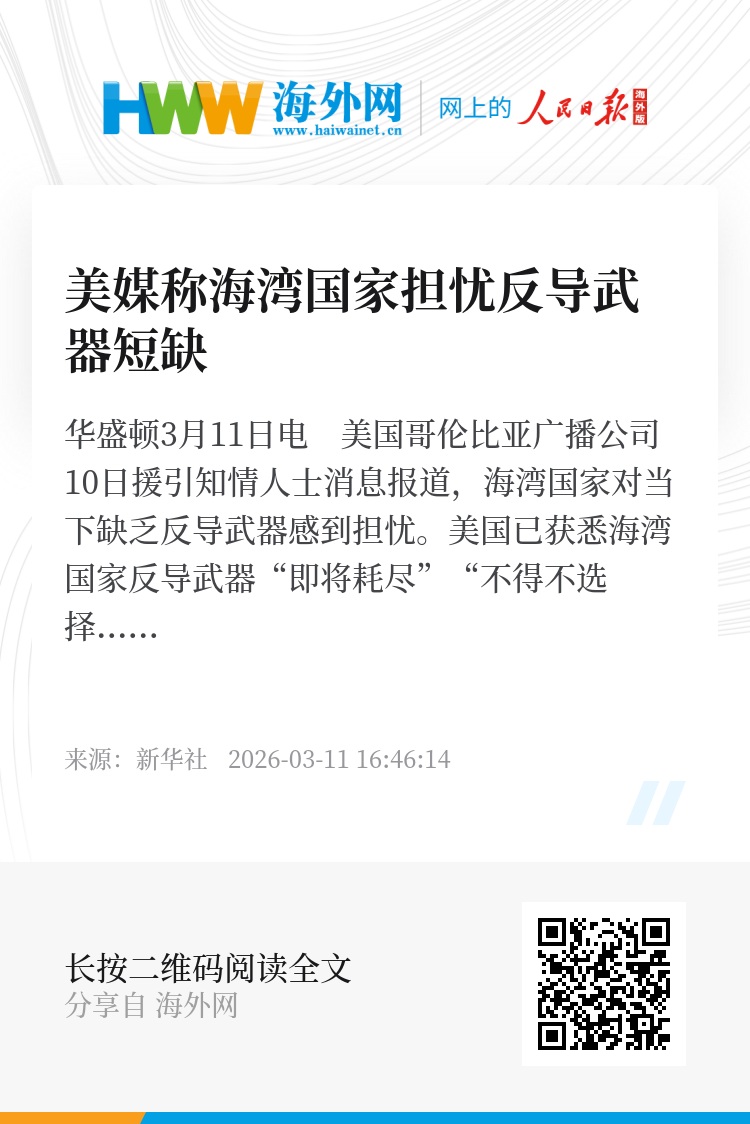 新华社华盛顿3月11日电 美国哥伦比亚广播公司10日援引知情人士消息报道,海湾国家对当下缺乏反导武器感到担忧。美国已获悉海湾国家反导武器“即将耗尽”“不得不选择优先拦截目标”。
