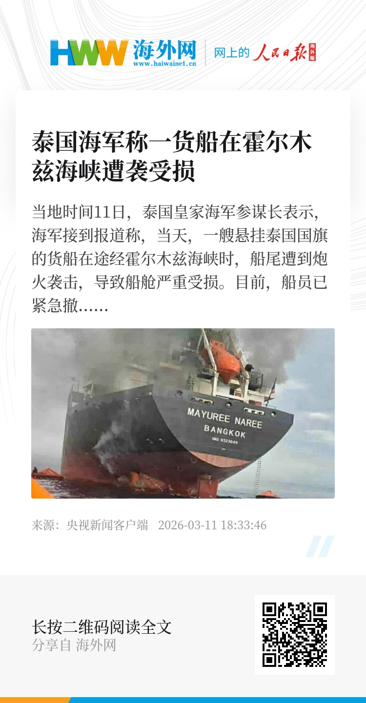 当地时间11日,泰国皇家海军参谋长表示,海军接到报道称,当天,一艘悬挂泰国国旗的货船在途经霍尔木兹海峡时,船尾遭到炮火袭击,导致船舱严重受损。