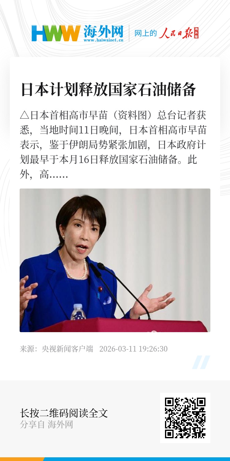 总台记者获悉,当地时间11日晚间,日本首相高市早苗表示,鉴于伊朗局势紧张加剧,日本政府计划最早于本月16日释放国家石油储备。