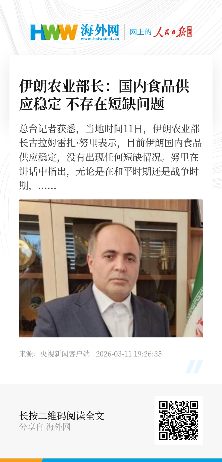 总台记者获悉,当地时间11日,伊朗农业部长古拉姆雷扎·努里表示,目前伊朗国内食品供应稳定,没有出现任何短缺情况。