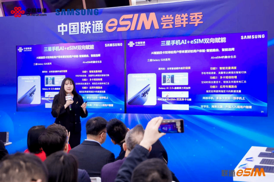 在联通方案解读环节,中国联通e补合作专家围绕“AI+eSIM”融合趋势,阐述了联通在eSIM技术适配、网络保障及权益创新方面的全面布局,并重点发布了针对Galaxy S26系列用户的专属“e补”权益政策。