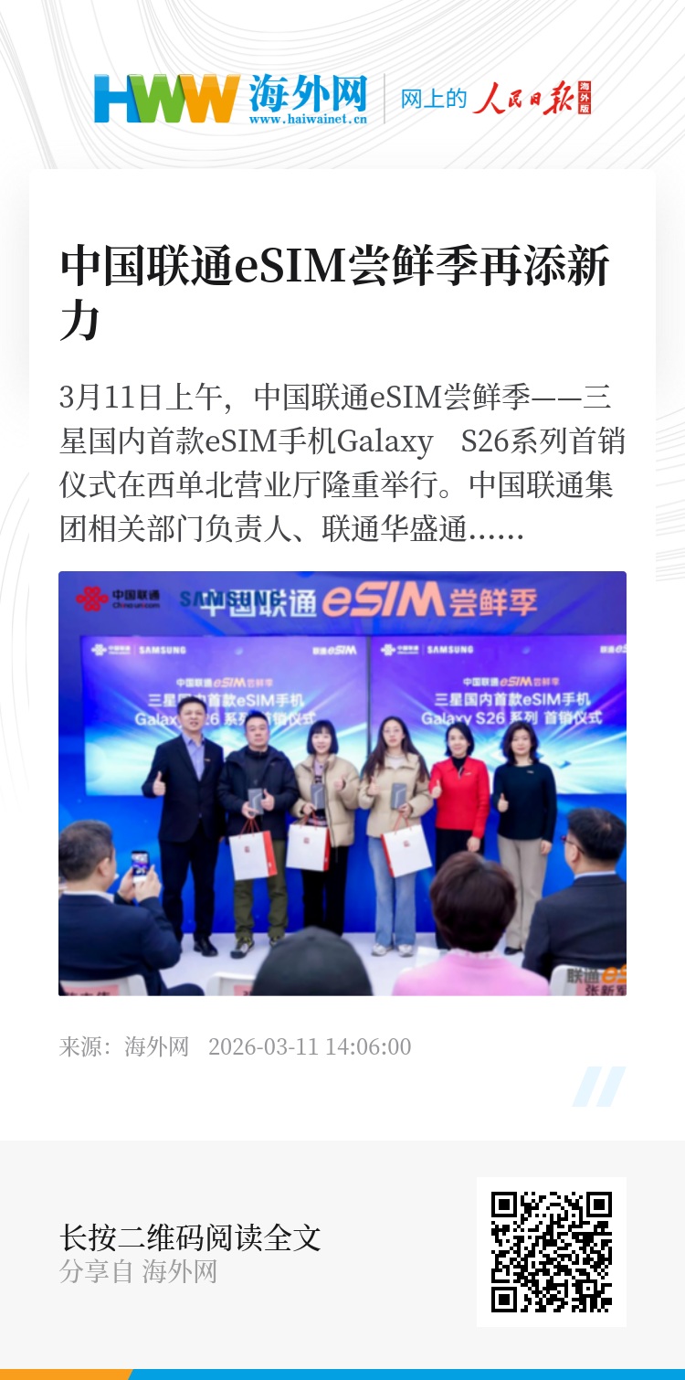 作为中国联通“eSIM尝鲜季”的重要一站,三星Galaxy S26系列的首销不仅丰富了国内eSIM手机阵营,更彰显了联通携手终端厂商推动eSIM规模商用的决心。未来,中国联通将继续深化与三星等全球领先伙伴的合作,加速eSIM技术在全品类终端中的普及,让更多用户畅享智慧、便捷的数字生活新未来。