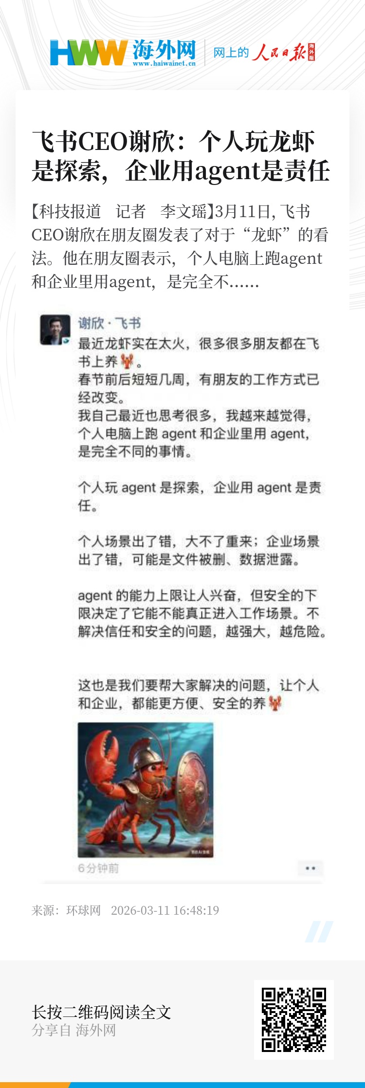 【环球网科技报道 记者 李文瑶】3月11日,飞书CEO谢欣在朋友圈发表了对于“龙虾”的看法。他在朋友圈表示,个人电脑上跑agent和企业里用agent,是完全不同的事情。