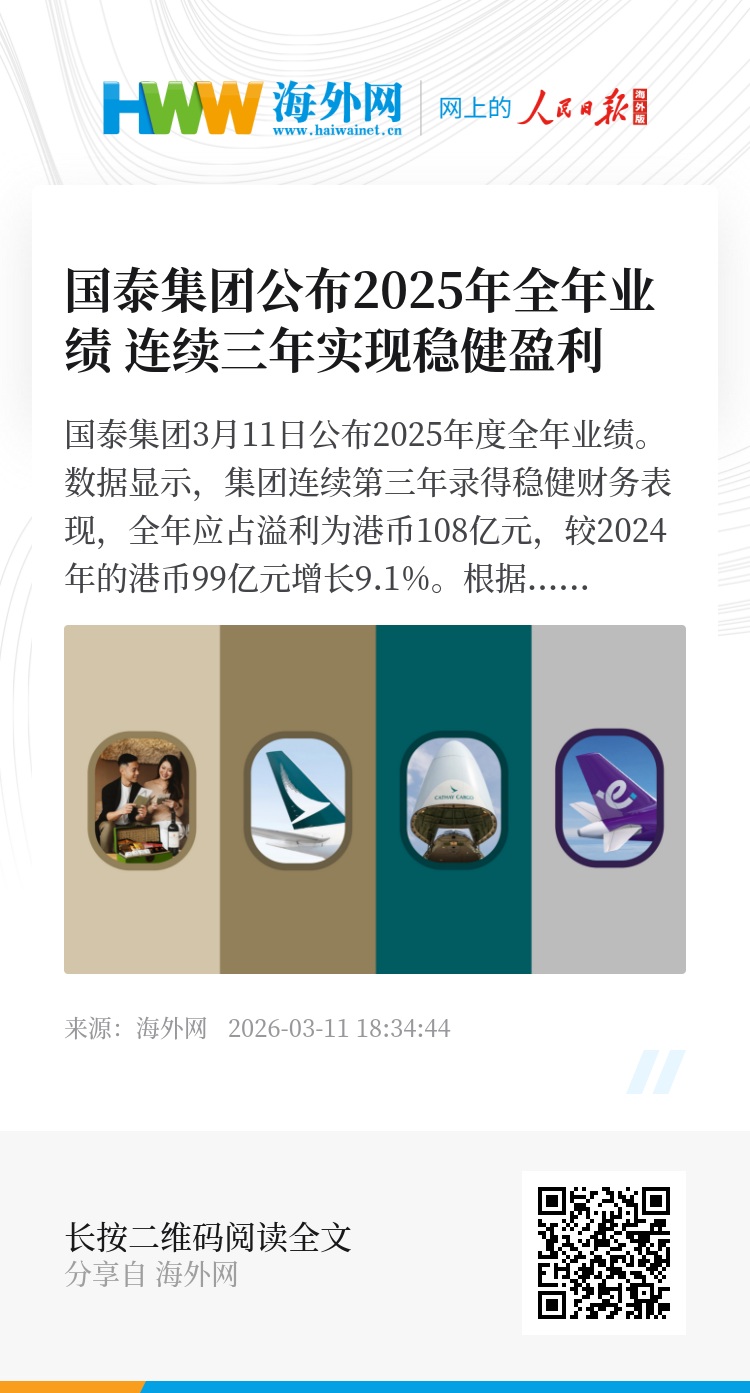 国泰集团3月11日公布2025年度全年业绩。数据显示,集团连续第三年录得稳健财务表现,全年应占溢利为港币108亿元,较2024年的港币99亿元增长9.1%。