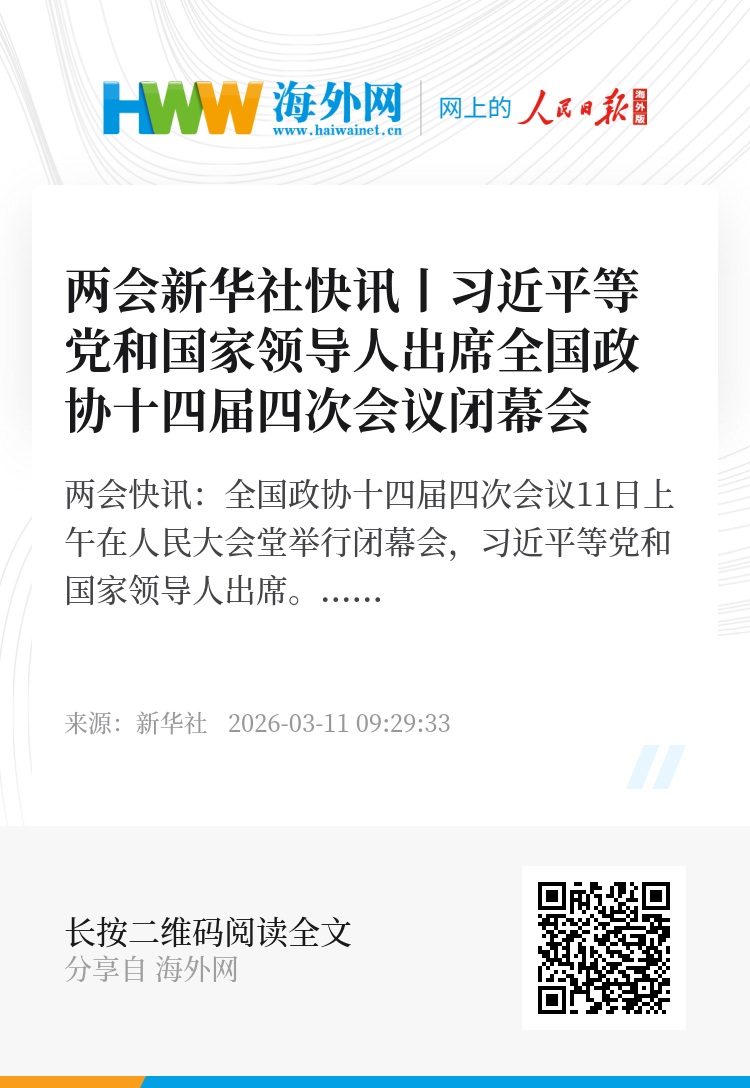 两会新华社快讯:全国政协十四届四次会议11日上午在人民大会堂举行闭幕会,习近平等党和国家领导人出席。