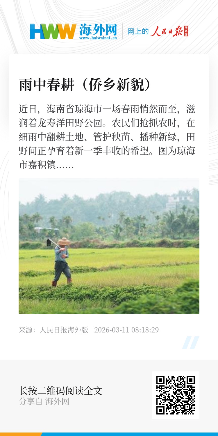 近日,海南省琼海市一场春雨悄然而至,滋润着龙寿洋田野公园。农民们抢抓农时,在细雨中翻耕土地、管护秧苗、播种新绿,田野间正孕育着新一季丰收的希望。
