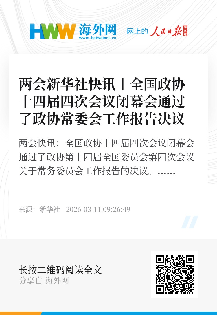 两会新华社快讯丨全国政协十四届四次会议闭幕会通过了政协常委会工作报告决议