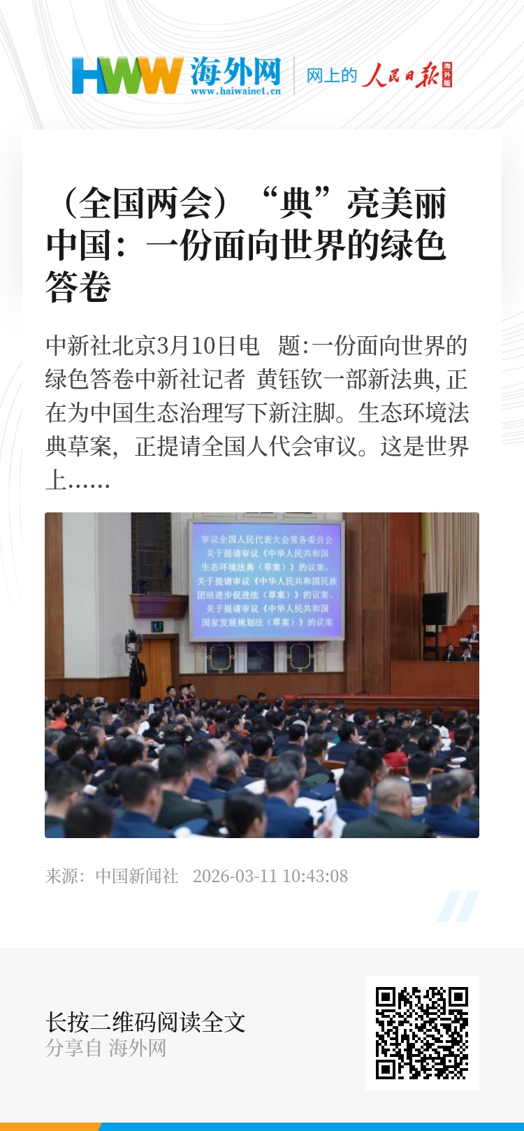中新社北京3月10日电 题:一份面向世界的绿色答卷