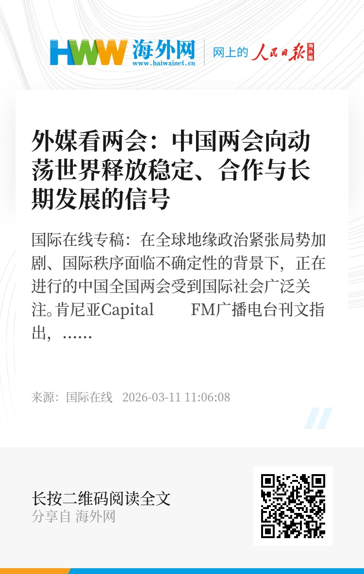 文章最后表示,当一些国家忙于分析眼前的战场形势时,中国两会已将目光投向未来五年乃至更长远的发展规划。中国作出的决策,展现了在增长与安全、创新与包容、国家发展与国际责任之间的有效平衡。中国两会不仅是一场重要的国内政治活动,更向世界传递出明确信号:稳定、发展以及通过对话实现持久和平,始终是中国追求的方向。(宫梦薇 实习生 万逍)