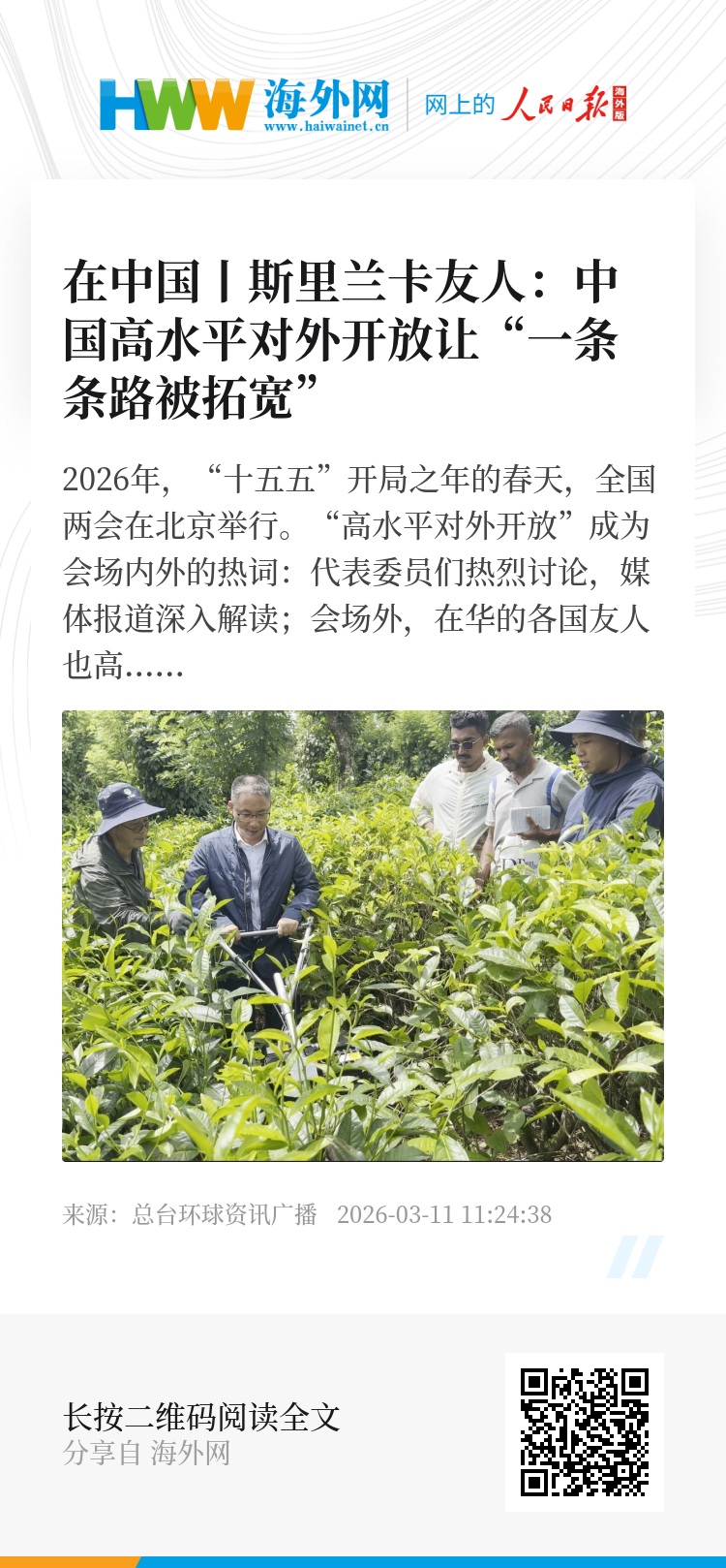 2026年,“十五五”开局之年的春天,全国两会在北京举行。“高水平对外开放”成为会场内外的热词:代表委员们热烈讨论,媒体报道深入解读;会场外,在华的各国友人也高度关注中国两会,来自斯里兰卡的晋兰加就是其中之一。