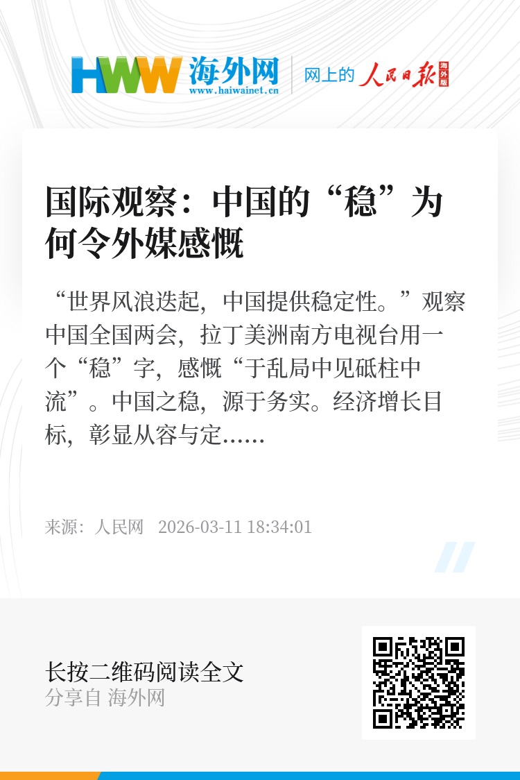 “世界风浪迭起,中国提供稳定性。”观察中国全国两会,拉丁美洲南方电视台用一个“稳”字,感慨“于乱局中见砥柱中流”。