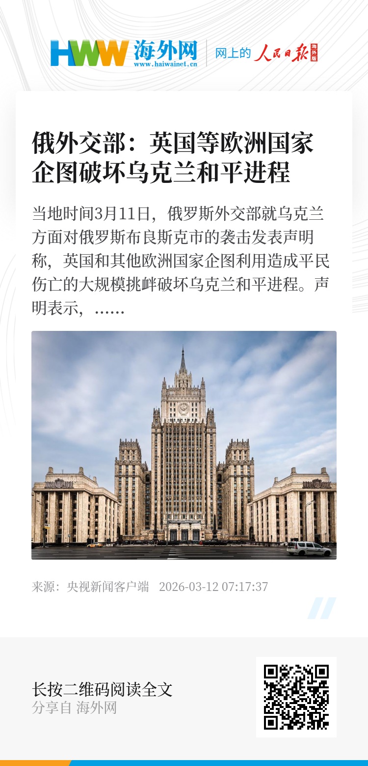 当地时间3月11日,俄罗斯外交部就乌克兰方面对俄罗斯布良斯克市的袭击发表声明称,英国和其他欧洲国家企图利用造成平民伤亡的大规模挑衅破坏乌克兰和平进程。