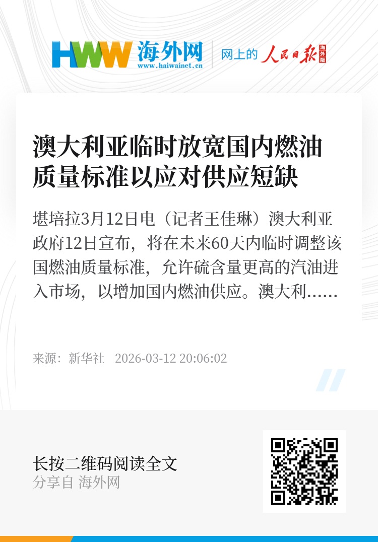 新华社堪培拉3月12日电(记者王佳琳)澳大利亚政府12日宣布,将在未来60天内临时调整该国燃油质量标准,允许硫含量更高的汽油进入市场,以增加国内燃油供应。