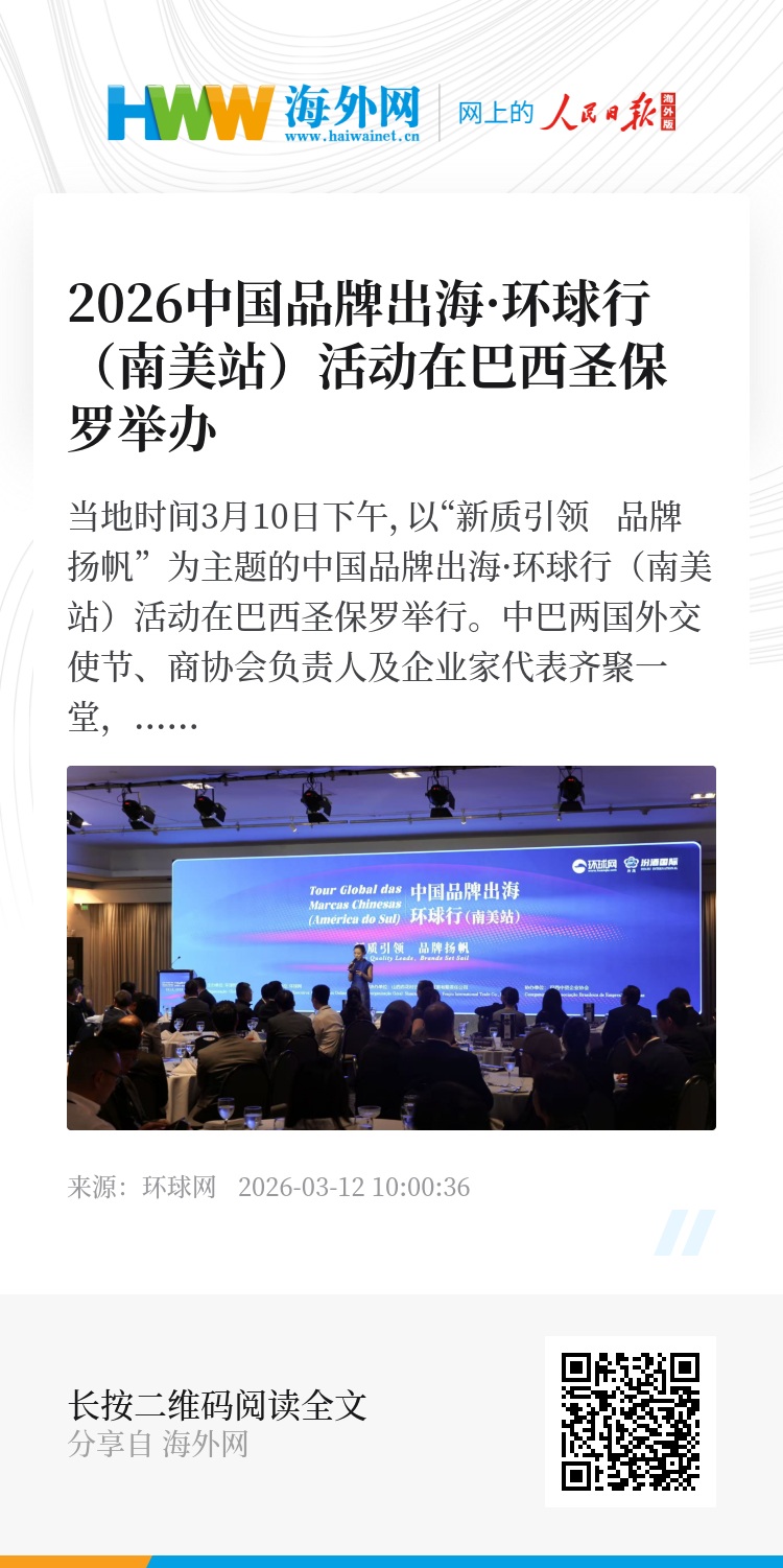 本次活动由环球时报社主办、环球网承办、汾酒国际总协办、巴西中资企业协会协办。从2025年米兰站启航,到2026年首站落地圣保罗,中国品牌出海·环球行的足迹不断延伸。未来,活动将继续搭建中国品牌与海外市场的合作桥梁,助力中国品牌以开放姿态拥抱世界,在全球化舞台上展现中国创造的创新与智慧。