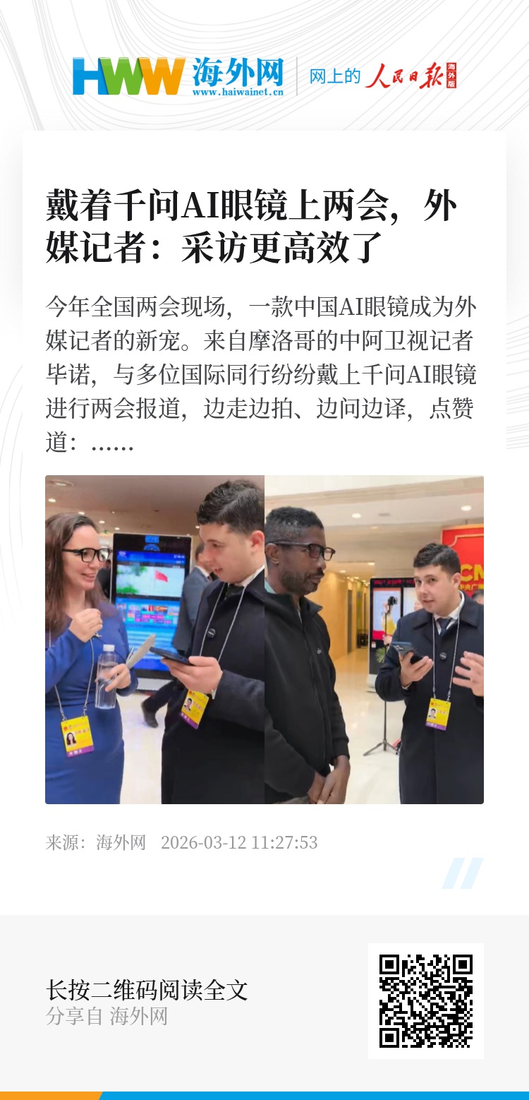 今年全国两会现场,一款中国AI眼镜成为外媒记者的新宠。来自摩洛哥的中阿卫视记者毕诺,与多位国际同行纷纷戴上千问AI眼镜进行两会报道,边走边拍、边问边译,点赞道:“能问答、能翻译、还能高清拍摄,中国科技太方便了。”