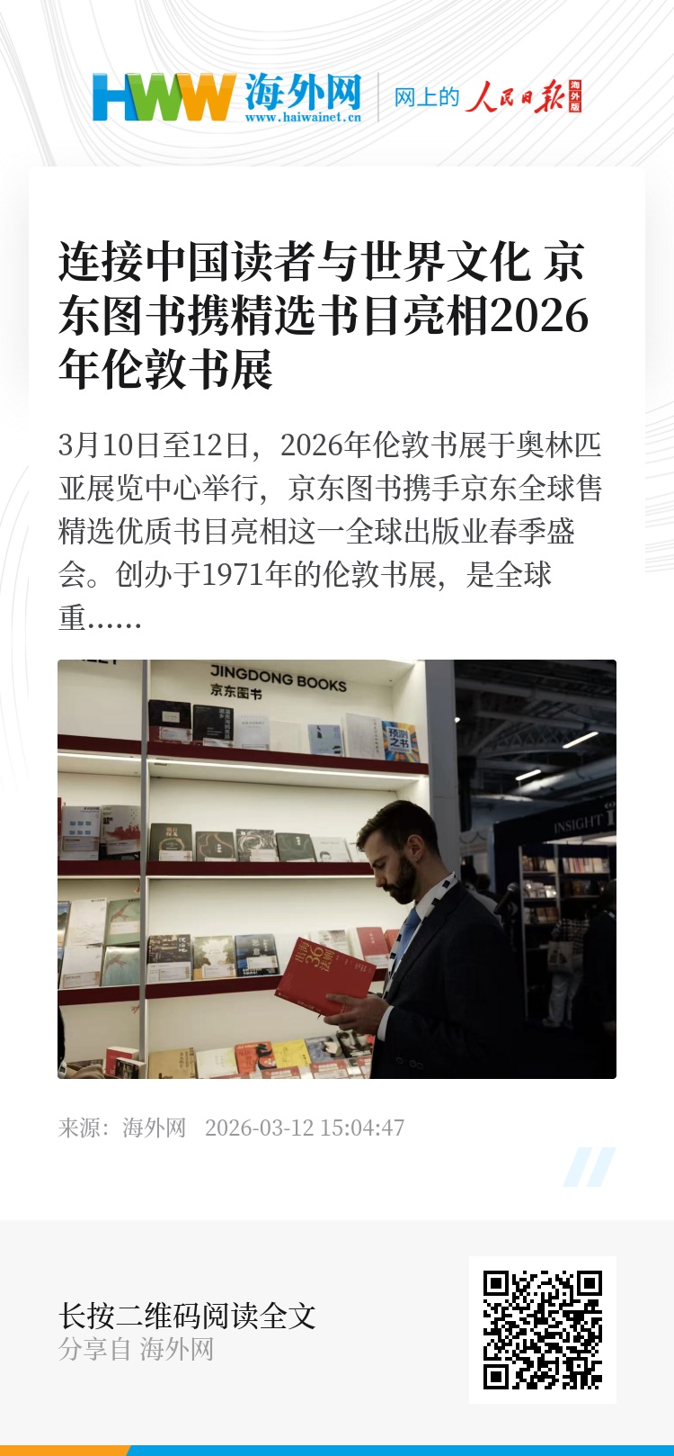3月10日至12日,2026年伦敦书展于奥林匹亚展览中心举行,京东图书携手京东全球售精选优质书目亮相这一全球出版业春季盛会。创办于1971年的伦敦书展,是全球重要的版权贸易盛会之一,也是中外出版界交流合作的平台。书展期间,京东图书与京东全球售精选的涵盖文学、社科、少儿等多领域的31本优质出版物集中展示,让国际书展上的中国内容与海外读者见面,也让更多海外优秀作品进入中国视野。