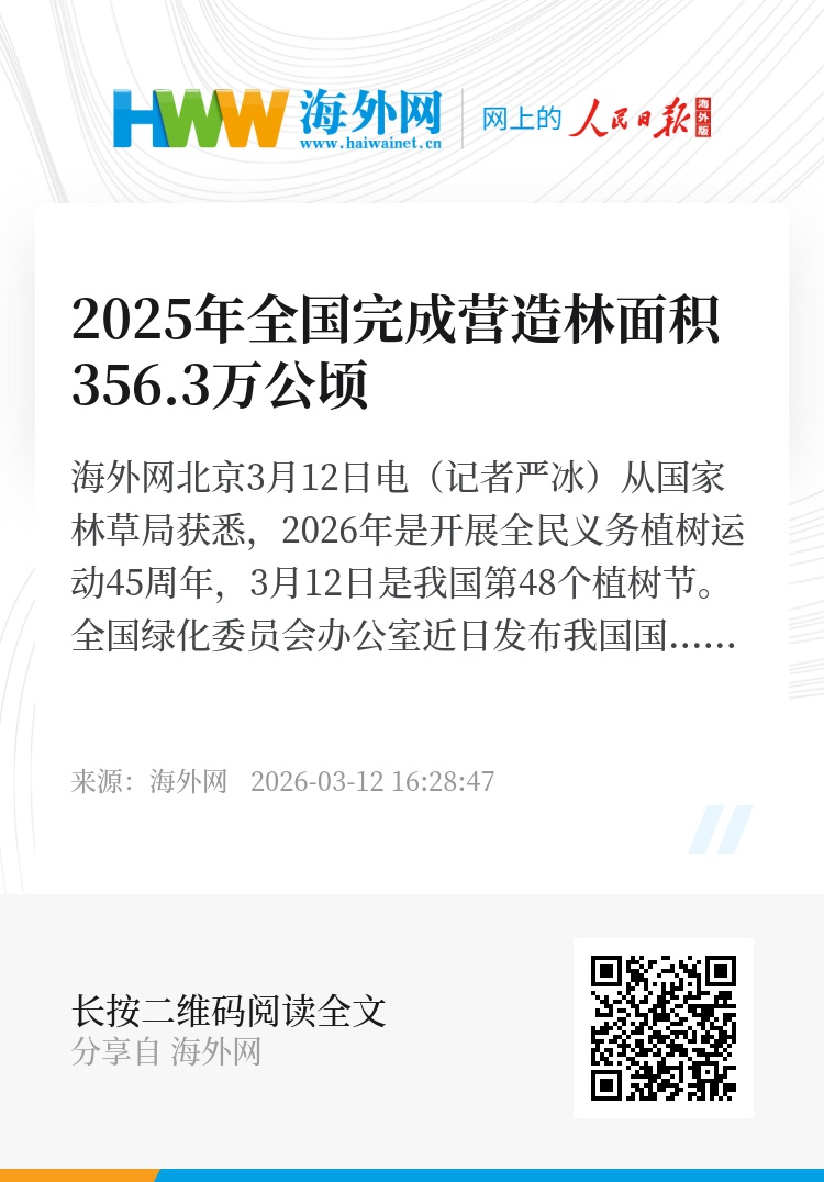 海外网北京3月12日电(记者严冰)从国家林草局获悉,2026年是开展全民义务植树运动45周年,3月12日是我国第48个植树节。全国绿化委员会办公室近日发布我国国土绿化状况公报。公报显示,2025年全国完成营造林面积356.3万公顷、退化草原修复治理面积492.7万公顷,森林覆盖率达到25.09%、林草覆盖率超过56%、森林蓄积量达到209.88亿立方米。绿水青山底色更靓、金山银山成色更足。