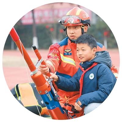 3月6日,江苏省淮安市洪泽实验小学,消防员指导小学生体验消防救援装备。