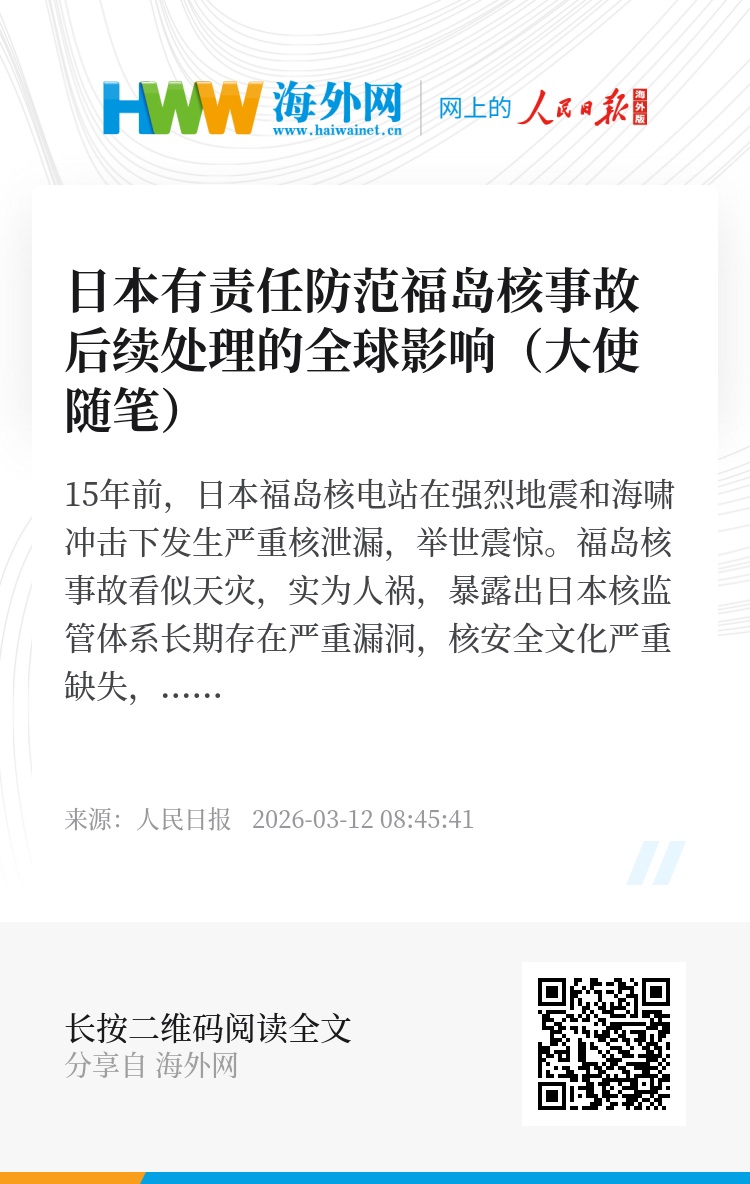 15年前,日本福岛核电站在强烈地震和海啸冲击下发生严重核泄漏,举世震惊。福岛核事故看似天灾,实为人祸,暴露出日本核监管体系长期存在严重漏洞,核安全文化严重缺失,给日本带来惨重深刻的教训。福岛核事故中断了全球核能发展势头,沉重打击国际社会对核安全的信心,许多国家被迫重新审视核能发展政策和规划,不得不付出更多时间、更高成本重新拥抱核能。