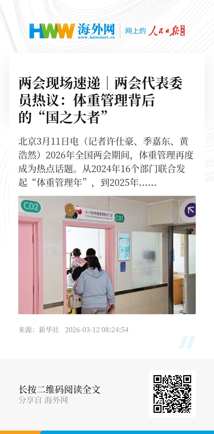 新华社北京3月11日电(记者许仕豪、季嘉东、黄浩然)2026年全国两会期间,体重管理再度成为热点话题。从2024年16个部门联合发起“体重管理年”,到2025年全国两会“国家喊咱减肥了”引发热议,这项专项行动已经步入第三个年头。