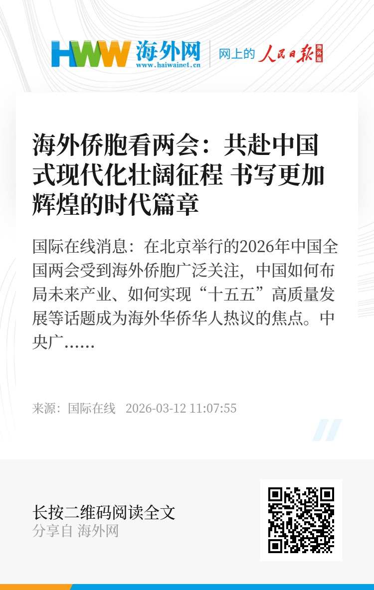 国际在线消息:在北京举行的2026年中国全国两会受到海外侨胞广泛关注,中国如何布局未来产业、如何实现“十五五”高质量发展等话题成为海外华侨华人热议的焦点。中央广播电视总台华语环球广播在全国两会期间举办“坚定信心 共赴新程——海外侨胞看两会”华语海外受众交流会,多位参加在线交流的海外华侨华人社团负责人表示,“十五五”中国锚定发展新质生产力的战略任务,向“高”攀升、向“新”迈进,广大海外侨胞,倍感振奋,满怀期许。一个充满创新活力的中国,不仅将为现代化注入不竭动力,也将为世界带来更多发展机遇。