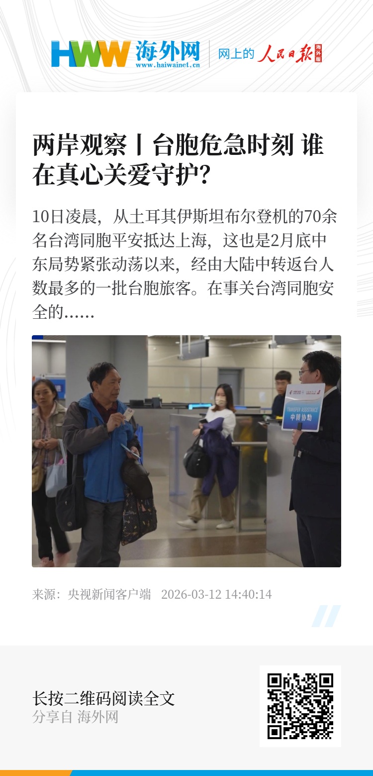 10日凌晨,从土耳其伊斯坦布尔登机的70余名台湾同胞平安抵达上海,这也是2月底中东局势紧张动荡以来,经由大陆中转返台人数最多的一批台胞旅客。在事关台湾同胞安全的危急时刻,祖国大陆以积极行动,展现以人为本、两岸一家。然而,民进党当局无所作为,还把心思都放在所谓“反中抗中”的政治操弄上,不仅抹黑大陆协助台胞撤离的行为“存在高度风险”,还声称“民众认为留在当地安全”,试图恐吓、阻挠台胞接受大陆提供的撤离协助。一边是大陆“兜底”爱护台胞、另一边是民进党当局“抗中”害惨台胞,岛内舆论直呼:危难面前,谁在真心护同胞,一目了然。