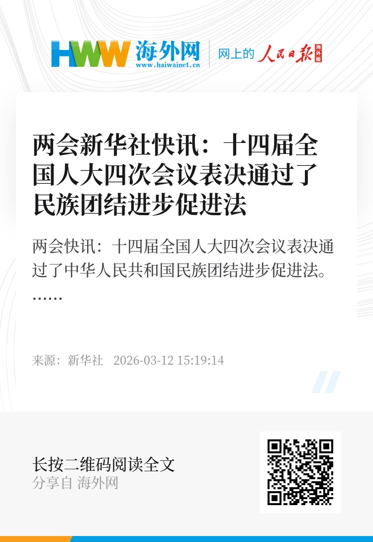 两会新华社快讯:十四届全国人大四次会议表决通过了中华人民共和国民族团结进步促进法。