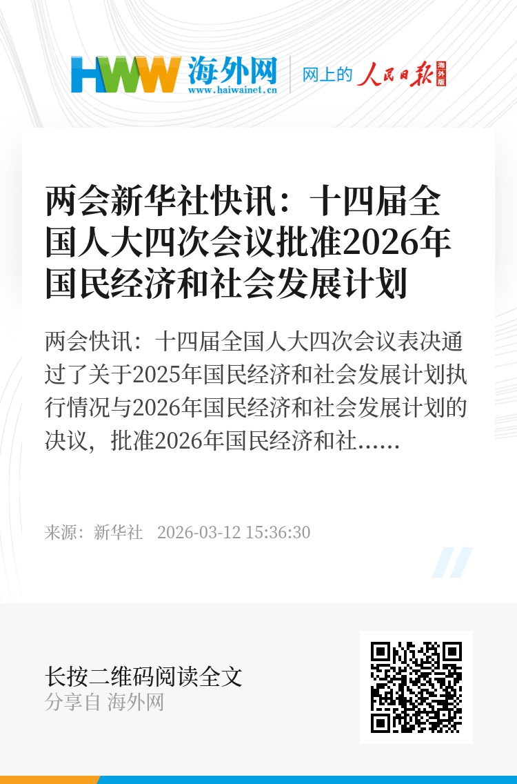 两会新华社快讯:十四届全国人大四次会议批准2026年国民经济和社会发展计划