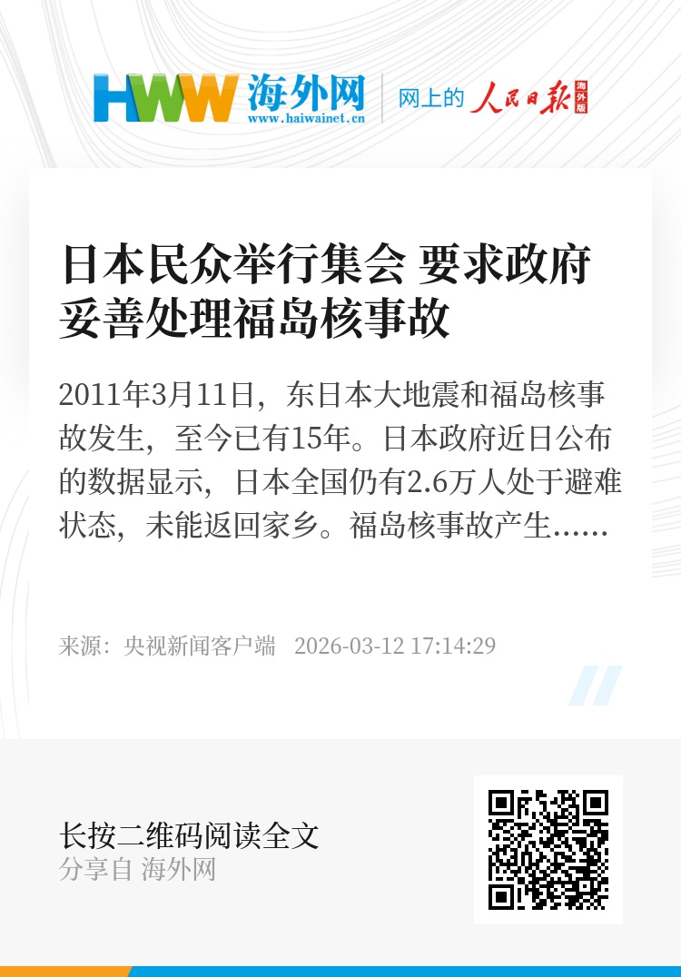 2011年3月11日,东日本大地震和福岛核事故发生,至今已有15年。日本政府近日公布的数据显示,日本全国仍有2.6万人处于避难状态,未能返回家乡。福岛核事故产生的核污染土处置问题进展缓慢。