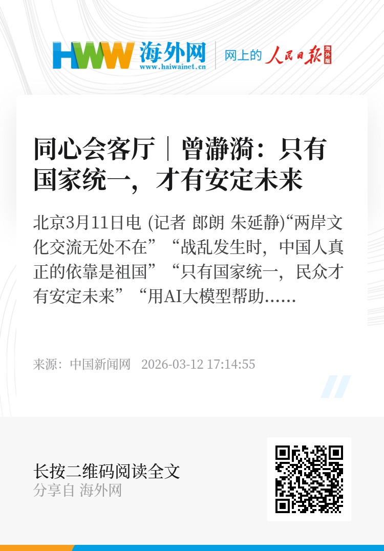 中新网北京3月11日电 (记者 郎朗 朱延静)“两岸文化交流无处不在”“战乱发生时,中国人真正的依靠是祖国”“只有国家统一,民众才有安定未来”“用AI大模型帮助台湾民众突破‘信息茧房’”……