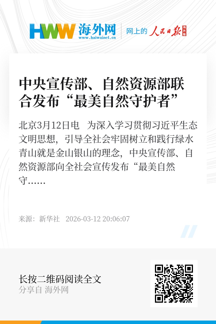新华社北京3月12日电 为深入学习贯彻习近平生态文明思想,引导全社会牢固树立和践行绿水青山就是金山银山的理念,中央宣传部、自然资源部向全社会宣传发布“最美自然守护者”。