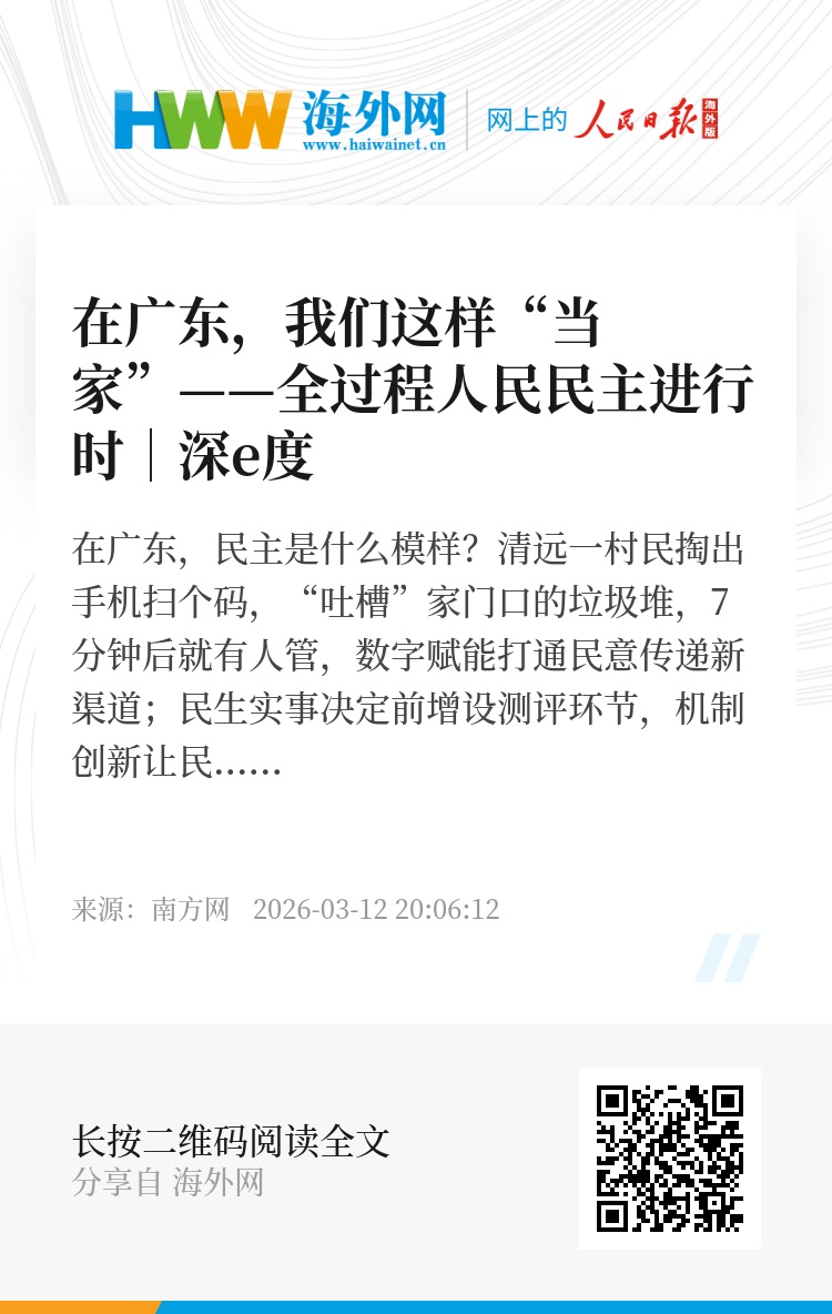 从“码上建言”到“闭环落实”,从“基层问计”到“共治共享”,全过程人民民主在南粤大地上不断创新、持续生长。民主在广东,成色更足,底色更亮。