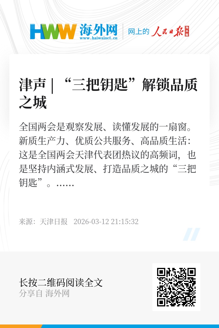 全国两会是观察发展、读懂发展的一扇窗。新质生产力、优质公共服务、高品质生活:这是全国两会天津代表团热议的高频词,也是坚持内涵式发展、打造品质之城的“三把钥匙”。