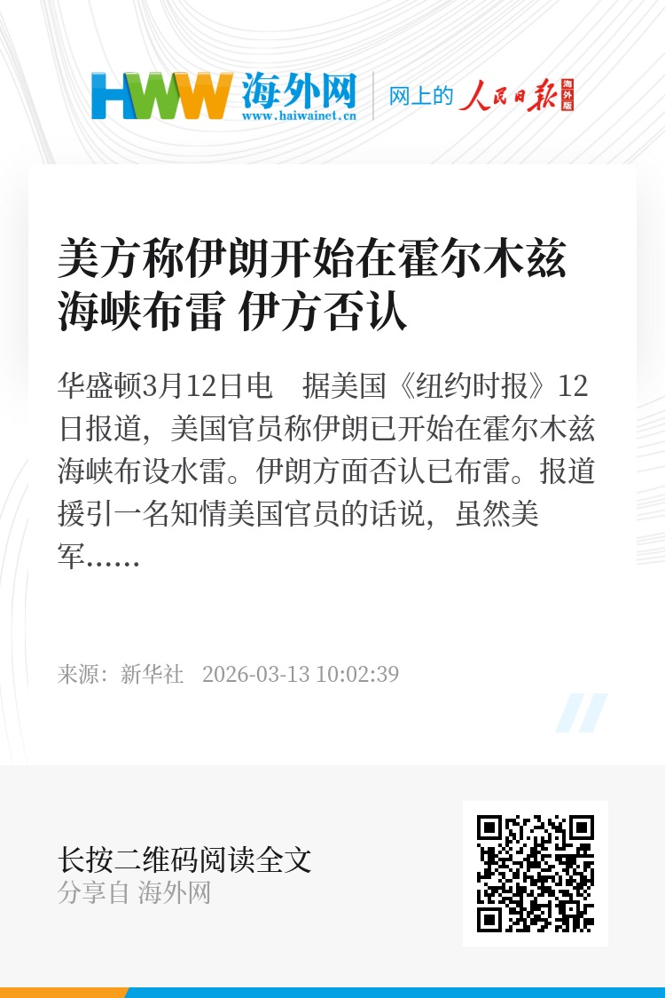 新华社华盛顿3月12日电 据美国《纽约时报》12日报道,美国官员称伊朗已开始在霍尔木兹海峡布设水雷。伊朗方面否认已布雷。