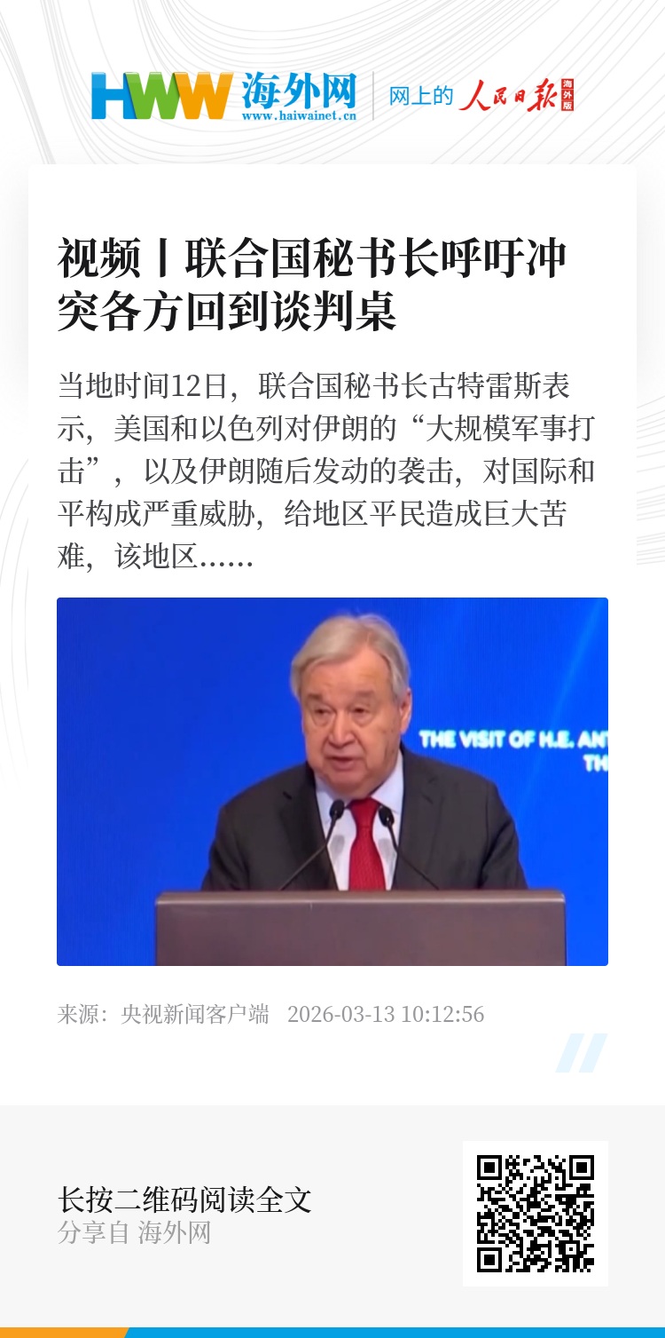 当地时间12日,联合国秘书长古特雷斯表示,美国和以色列对伊朗的“大规模军事打击”,以及伊朗随后发动的袭击,对国际和平构成严重威胁,给地区平民造成巨大苦难,该地区正在被推向崩溃的边缘,其影响正在全球范围内显现。他敦促冲突各方停止敌对行动,遵守国际法,保护平民,并立即回到谈判桌。