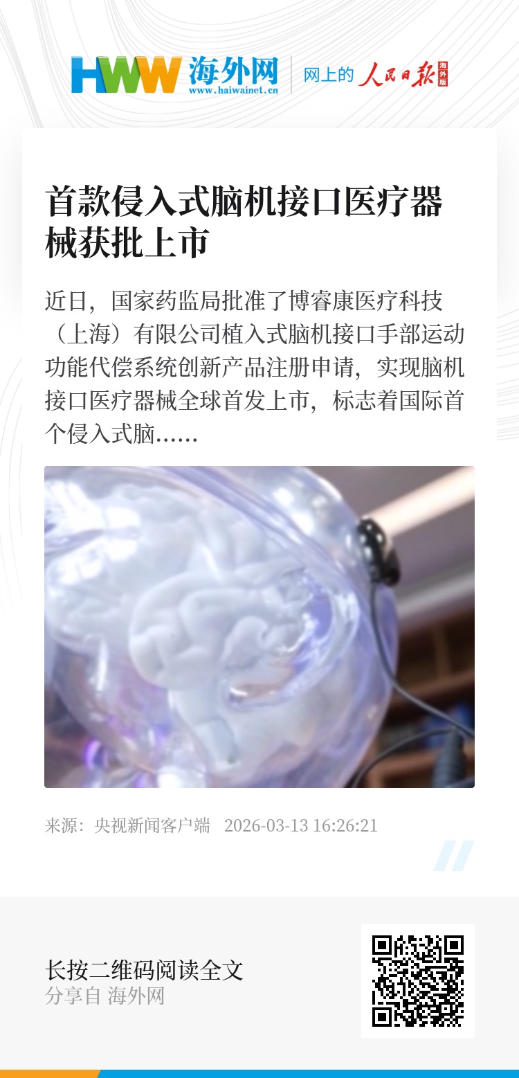 近日,国家药监局批准了博睿康医疗科技(上海)有限公司植入式脑机接口手部运动功能代偿系统创新产品注册申请,实现脑机接口医疗器械全球首发上市,标志着国际首个侵入式脑机接口医疗器械进入临床应用阶段。