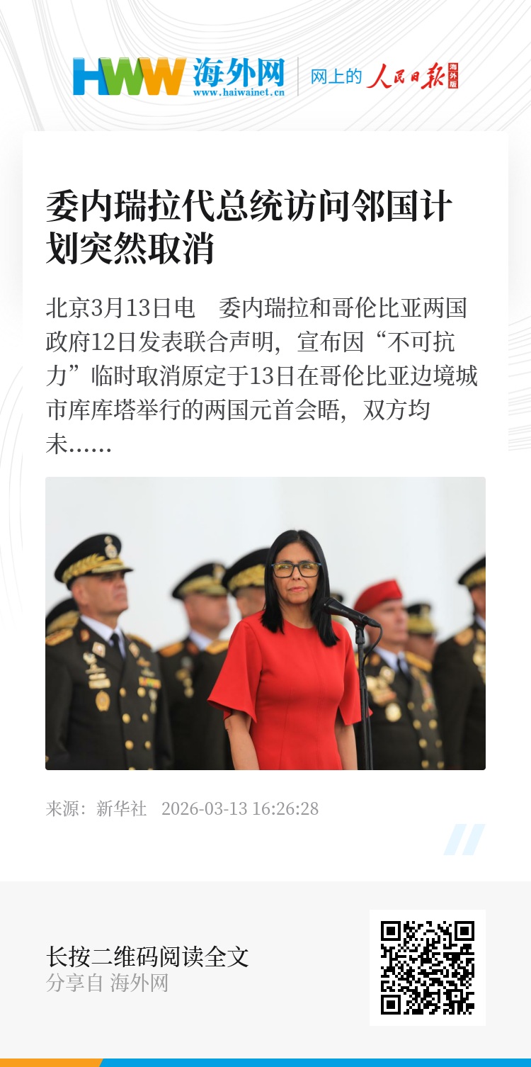 新华社北京3月13日电 委内瑞拉和哥伦比亚两国政府12日发表联合声明,宣布因“不可抗力”临时取消原定于13日在哥伦比亚边境城市库库塔举行的两国元首会晤,双方均未说明具体原因。