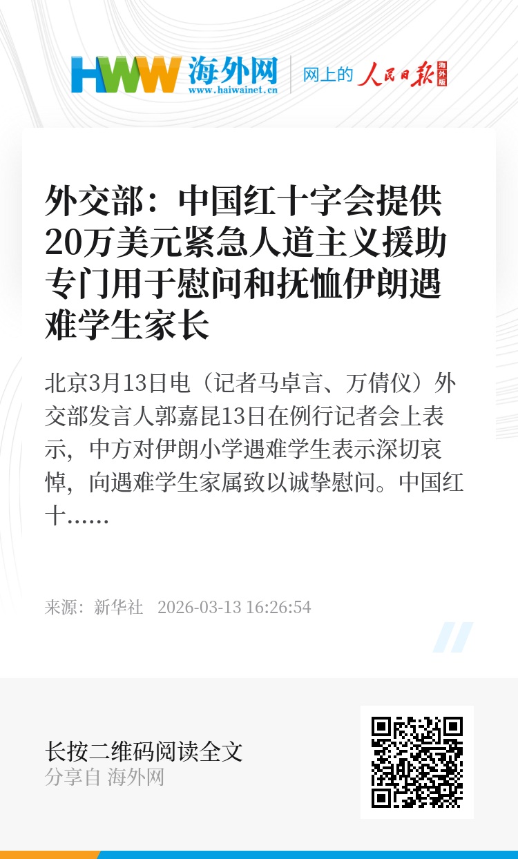 新华社北京3月13日电(记者马卓言、万倩仪)外交部发言人郭嘉昆13日在例行记者会上表示,中方对伊朗小学遇难学生表示深切哀悼,向遇难学生家属致以诚挚慰问。中国红十字会决定向伊朗红新月会提供20万美元紧急人道主义援助,专门用于慰问和抚恤遇难学生家长。