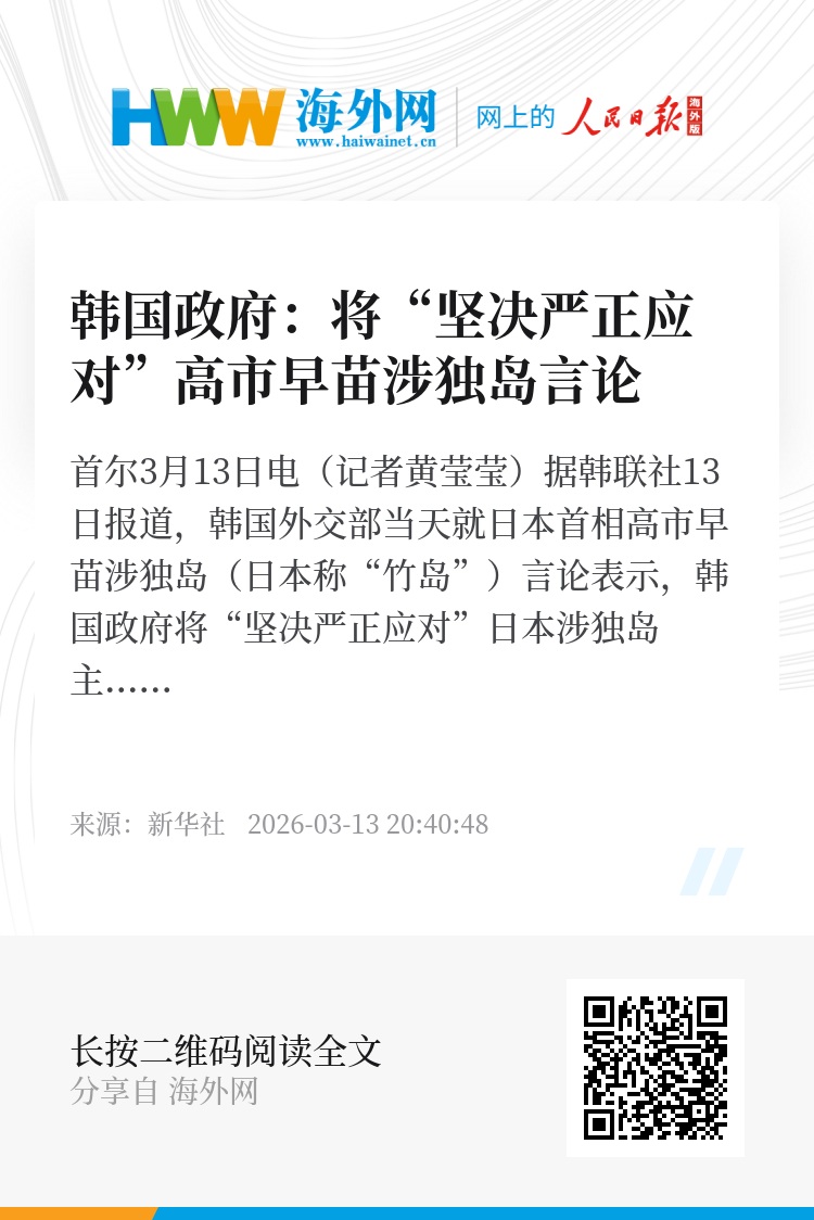 新华社首尔3月13日电(记者黄莹莹)据韩联社13日报道,韩国外交部当天就日本首相高市早苗涉独岛(日本称“竹岛”)言论表示,韩国政府将“坚决严正应对”日本涉独岛主权问题的任何“不当主张”。