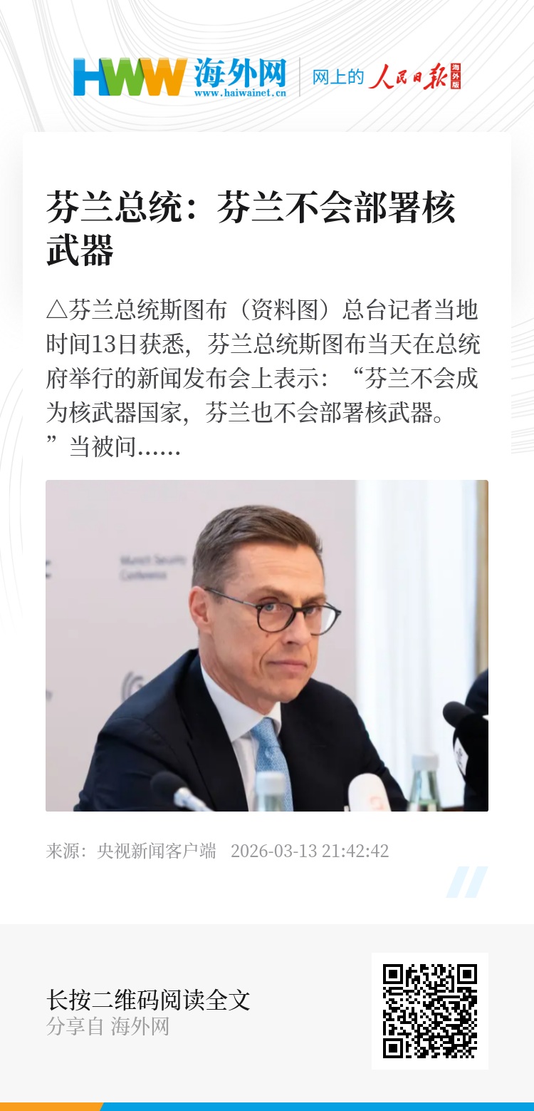 总台记者当地时间13日获悉,芬兰总统斯图布当天在总统府举行的新闻发布会上表示:“芬兰不会成为核武器国家,芬兰也不会部署核武器。”